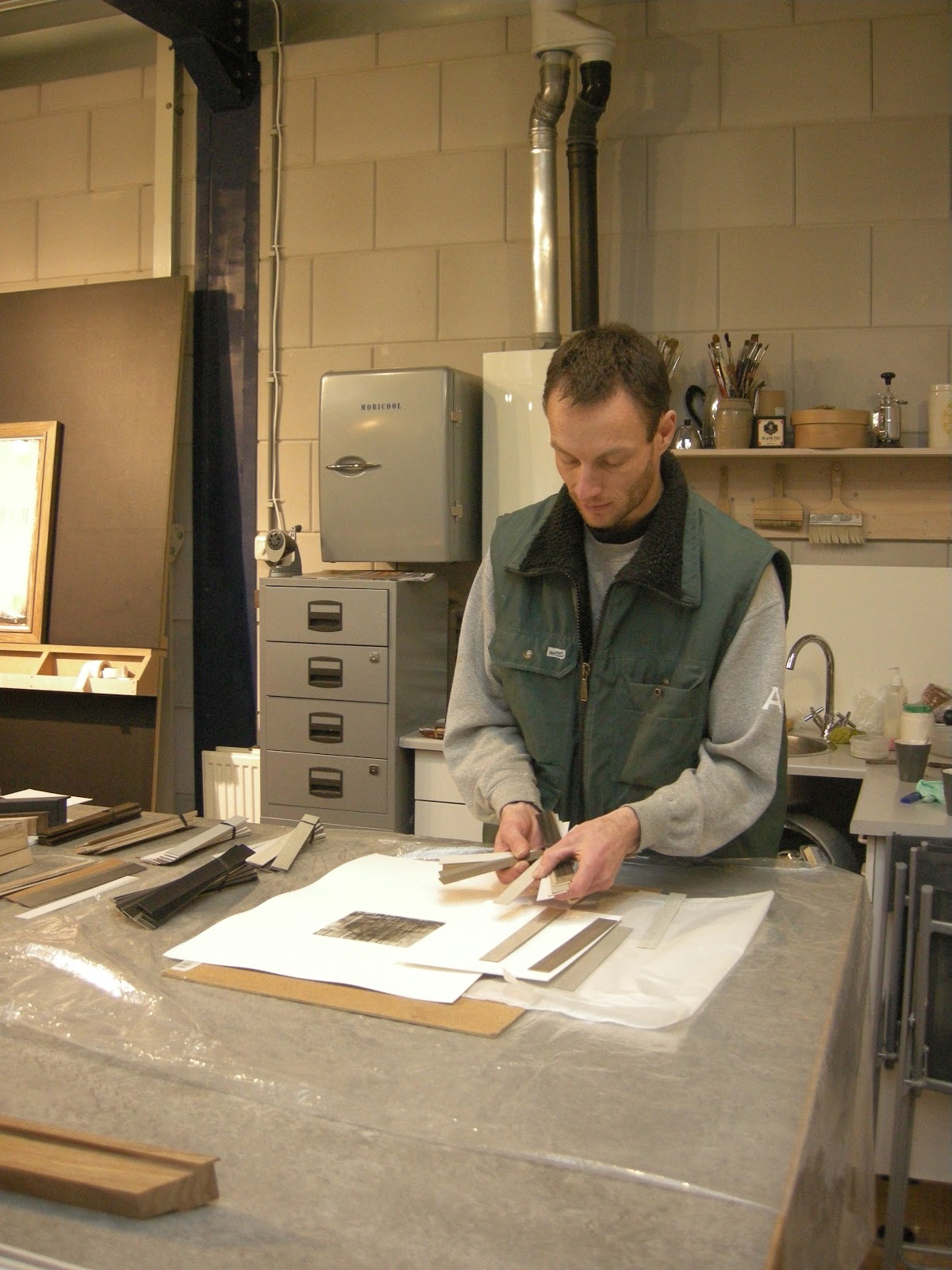 Een lijst wordt geheel door hem vervaardigd, van plank naar profiel en het is meer dan vakwerk, hij heeft een groot talent. Vandaag was ik bij hem en zag een prachtige lijst van Manzonia hout met een vleugje goud. Hij weet de kwaliteiten van alle soorten hout te pakken en heeft daarbij een heel eigen kleuren pallet ontwikkeld. Steeds weer verrast hij me met de finesses die hij in zijn profielen weet te leggen. Hij maakt zelf zijn stijfsel om de werken op papier mee te verlijmen op verantwoorde wijze. Hij werkt met een groot assortiment passe-partout van hoge kwaliteit, oa van katoen. En het is niet eens duurder dan een standaard lijst maar wel zoveel mooier! Daarbij is Jacco heel milieu bewust, het afvalhout wordt geperst tot ‘brokken’ en als stookhout gebruikt.