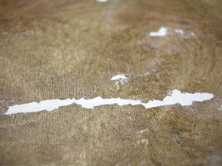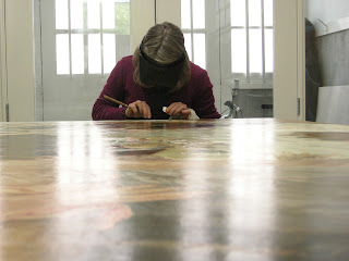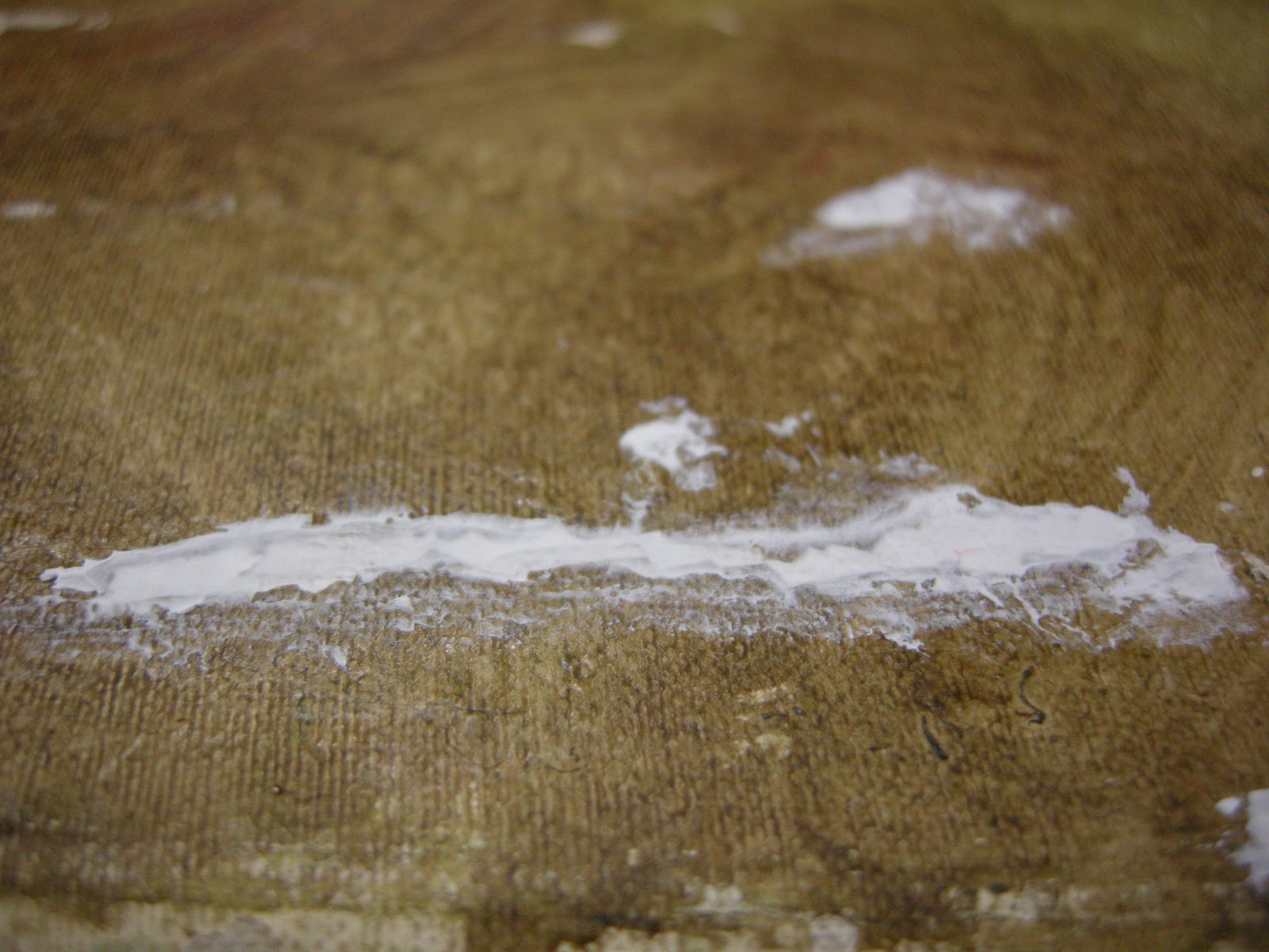 Samen met Beatriz plamuren we honderden kleine oppervlakkige lacunes in een schilderij met Flügger  uit Denemarken. Te bestellen in de UK maar je moet wel wat geduld hebben….Morgen weer een dag.